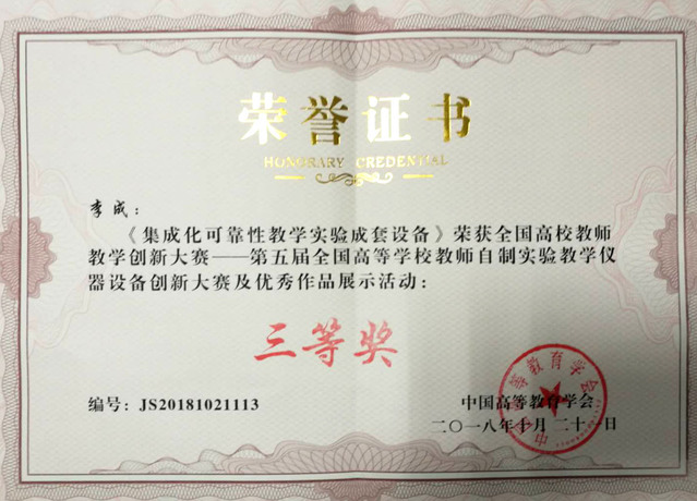 第五届全国高校教师自制实验教学仪器设备创新大赛由中国高等教育学会主办,是全国高校教师教学创新大赛的实验创新部分,旨在调动广大教师参加实验教学改革和实验技术研究的积极性,提升教师的教学能力和业务水平。大赛自2018年6月启动以来,获得了广泛关注,大赛组委会专家组对报名作品进行了初赛网评,评审出249件作品,获得决赛入围资格。pa电子pa电子官方网站李成副教授自主研发的“集成化可靠性教学实验成套设备”入围决赛,参加了10月19日至21日在成都举办的中国高等教育博览会中的“第五届全国高等学校教师自制实验教学仪器设备创新大赛及优秀作品展览”,经过现场展示、专家评审,荣获三等奖。