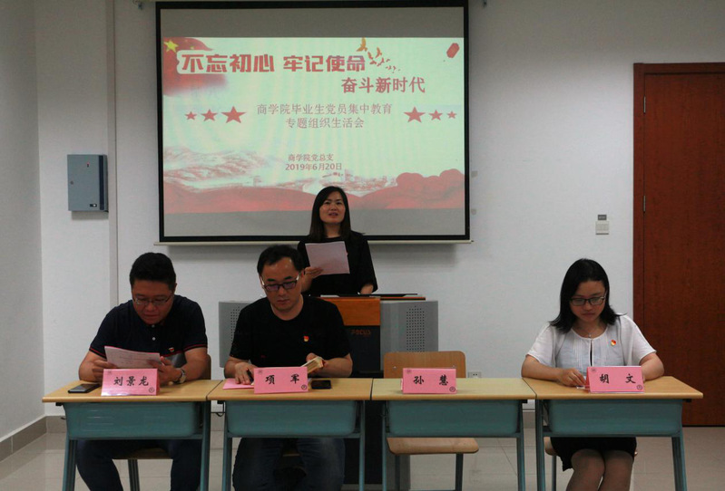 6月20日晚,pa电子官方网站党总支在商院224开展了以“不忘初心,牢记使命,奋斗新时代”为主题的毕业生党员集中教育专题组织生活会,党总支书记项军、专职组织员孙慧、第七党支部书记胡文、第八党支部书记刘景龙、pa电子官方网站全体学生党员、部分发展对象和积极分子代表参加了本次专题组织生活会,会议由孙慧主持。