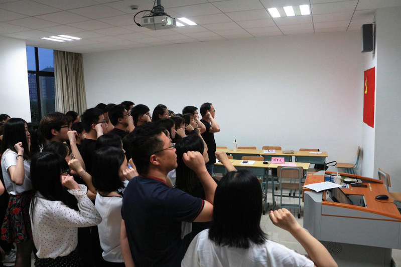 面对党旗进行入党宣誓,是每一位党员都经历过的庄严神圣的仪式,其意义不止于一个简单的动作,而在于宣誓忠诚、牢记使命、坚定信念,重温入党誓词,让红色基因永远传承。在孙慧老师的带领下,全体起立,面向党旗,举右手握拳过肩,重温入党誓词。