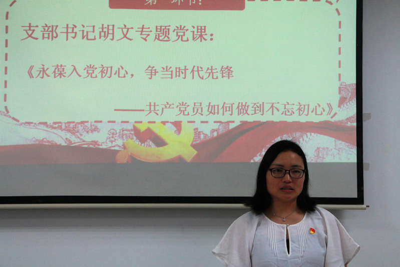 第七党支部书记胡文首先以《永葆入党初心,争当时代先锋——共产党员如何做到不忘初心》为题为大家上专题党课。她以95岁老党员张富清同志60多年深藏功名的事迹为例,讲述了张富清同志用自己一辈子的行动,践行了一名中共党员的不忘初心。不忘初心,意味着责任如山,意味着担当如铁,意味着奉献如常。作为共产党员,就应该平常时候看得出来,关键时刻站得出来,危急关头豁得出来。