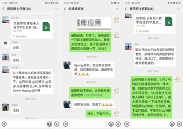 为了保障pa电子官方网站2827名学生“选得上,学得了”,所有辅导员和带班班主任认真领会学校关于线上教学的要求,做好任课老师和班级同学的传声筒,不让一个学生掉队。为了更好地掌握疫情防控期间学生存在的困难与需求,帮助有需要的同学们暂缓燃眉之急,陈秀春老师发动专兼职辅导员通过微信、电话、QQ等方式与同学们和家长取得联系,及时了解学生们存在的问题,是否有稳定的网络、是否有合适的设备、是否要用流量等,确保不遗漏任何一名同学,确保详细的了解到每一名同学的情况,为同学们排忧解难。
