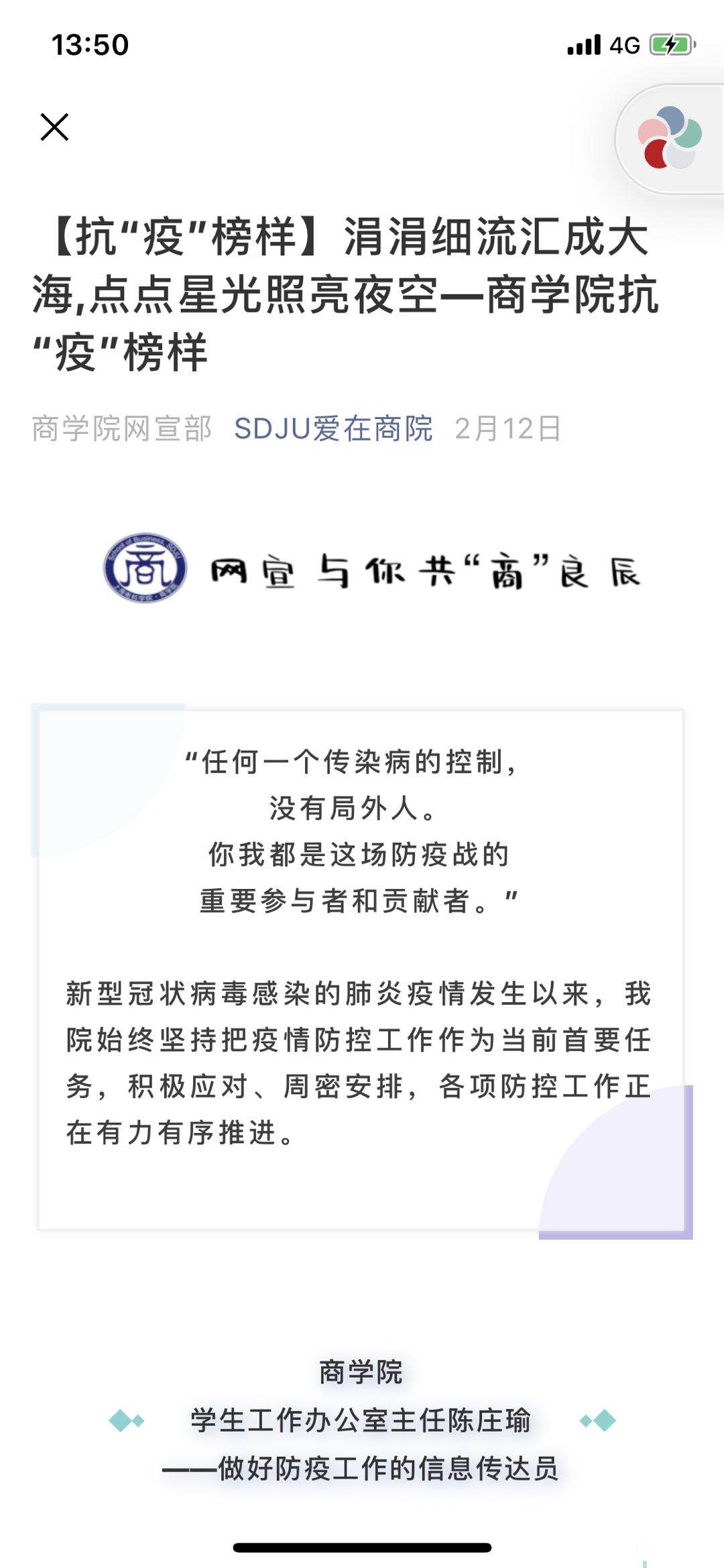 “学院充分利用官网、新媒体平台,发掘学生当中的抗“疫”榜样,转发防疫知识,灵活助力学院疫情防控工作。”辅导员李晴如是说。自疫情爆发以来,为了缓解大家长期“宅”家可能产生的不良情绪,她及时成立学院宣传工作小组,发起战“疫”防控的倡议书,呼吁全体商院学子保持镇定,做好防护,合理规划时间;积极征集身边的抗疫故事,提高舆论引导实效,目前公众号已推送包括毕业党员、退伍士兵、少数民族学生等学生志愿者典型事迹14余例;同时提前策划部署一系列线上活动,征集学生宅家的作品、视频等等,充实同学们的生活;最近线上教学期间,她准备收集更多学生在线学习的反馈,为学院完善线上教学工作提供意见。