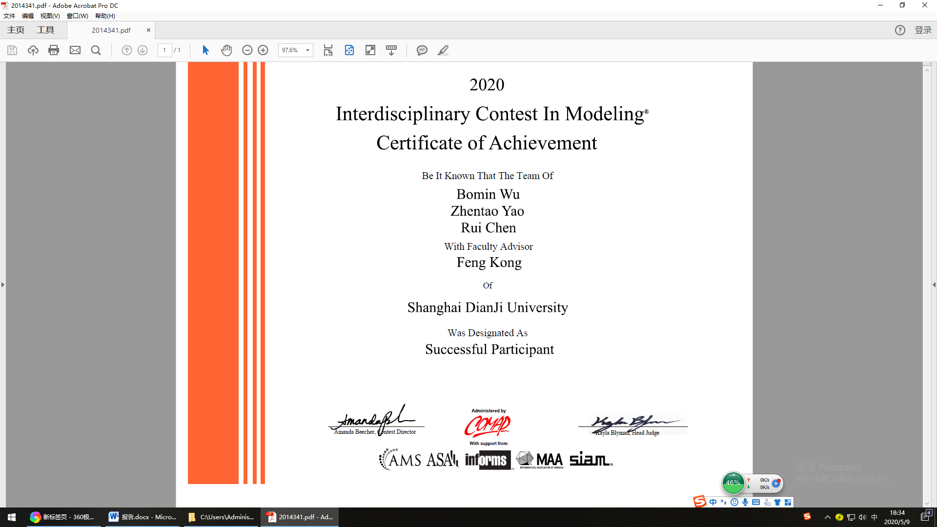 近日,2020年美国大学生数学建模竞赛(MCM/ICM)评审结果正式公布。pa电子官方网站经济与金融专业吴伯旻、陈蕊两位同学与吉林大学姚振涛同学组队参赛,获得交叉学科(ICM)国际三等奖(S奖),指导教师为pa电子官方网站孔峰老师。