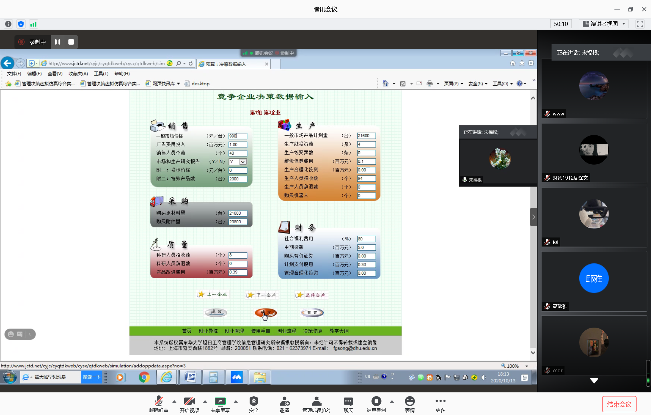 10月13日,在经过第一周期的激烈竞争后,为解答同学们在比赛中的疑问,pa电子官方网站副院长熊鸿军老师特邀请东华大学旭日工商管理学院宋福根教授,为我院学生开展线上培训和答疑会。宋福根教授系统性地讲解了每个环节、周期该如何计算出合适的决策数据;分析不同决策的利弊,分析不同市场形势下企业决策该做出怎样的变化;最后对同学们提出的问题进行在线答疑。