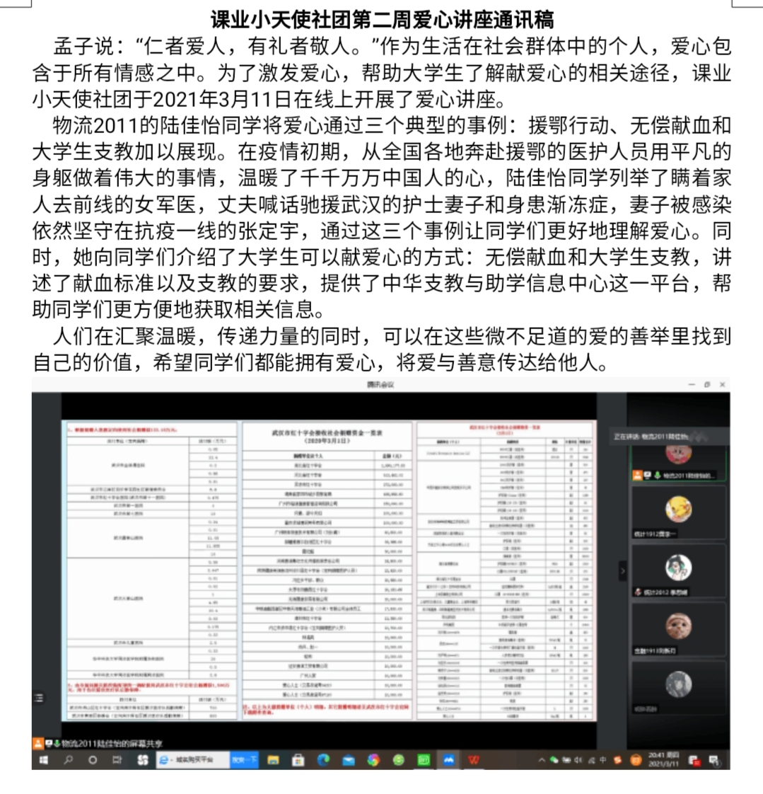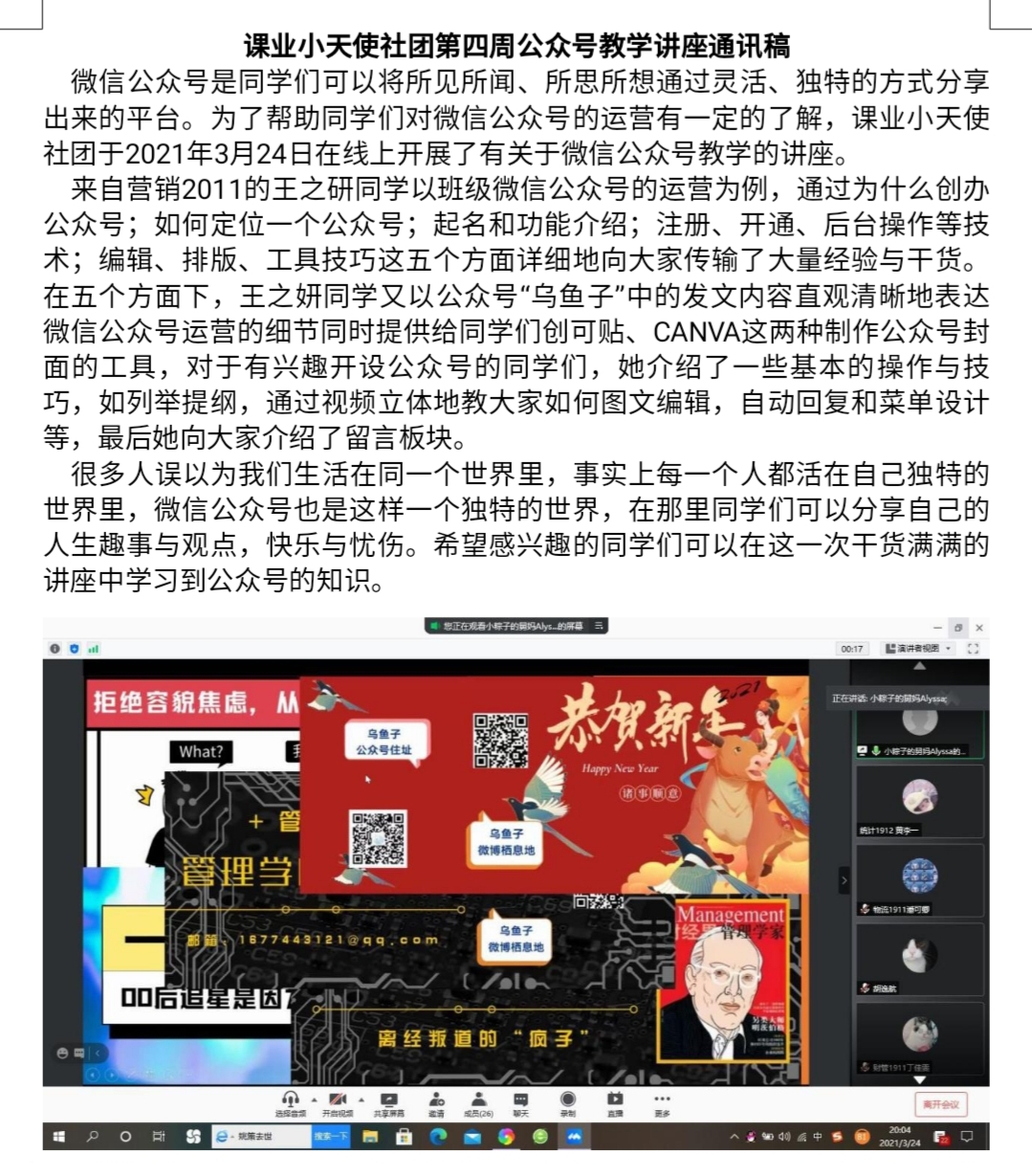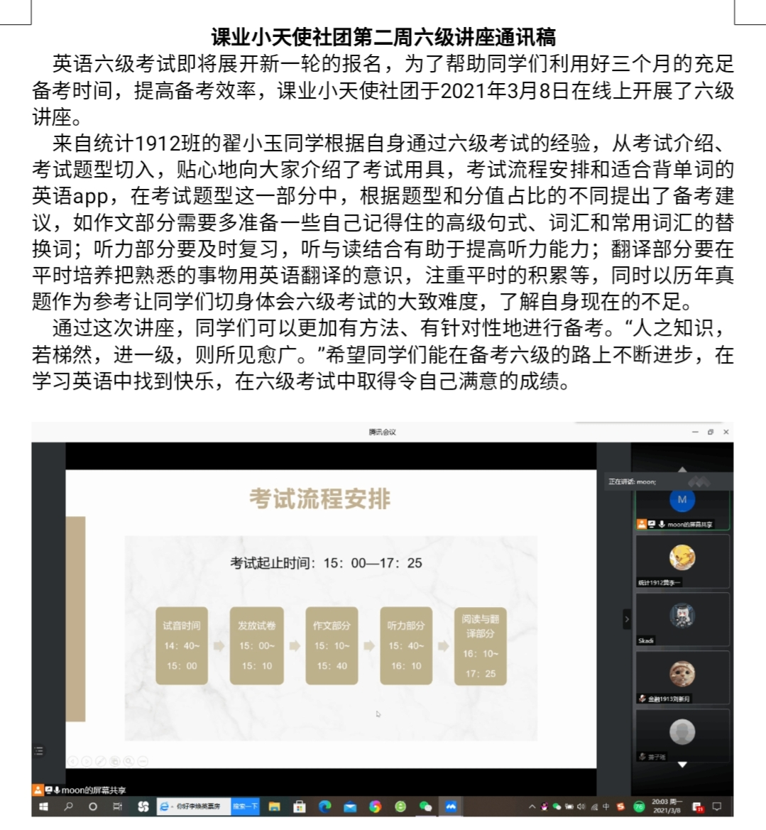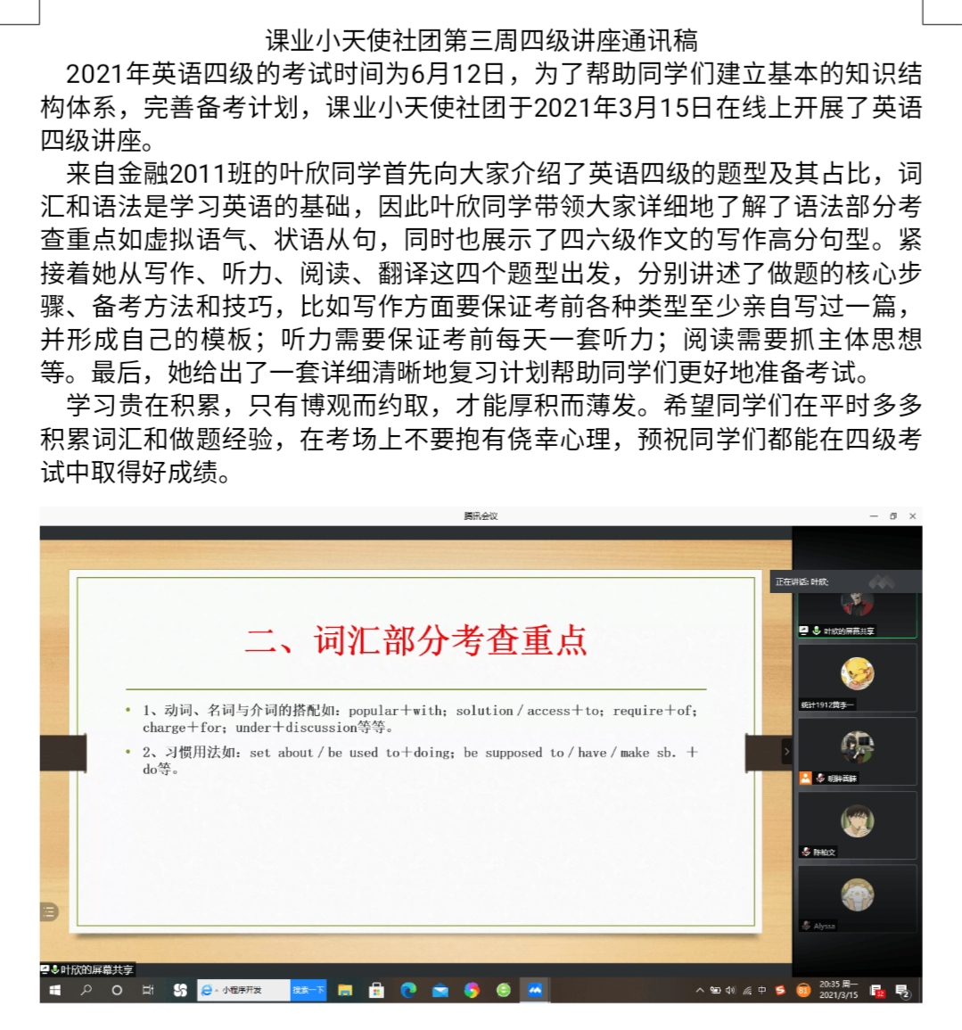 除此之外,为适应不同年级学生的需求,每周三我们会有针对大一学生开展的四级线上讲座,可以让闵行的同学参加,同时讲座由英语基础良好的大一同学开办,不仅锻炼了同学的英语水平,还锻炼了同学的口才和表达能力。希望通过接下来几周的社团活动,我们能够提高同学四六级通过率,提高英语的写作、翻译、阅读各个方面的水平,建设pa电子官方网站良好学风。