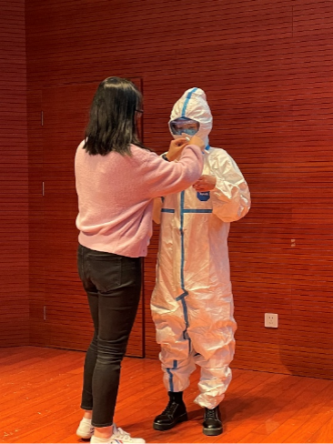 陈远方医生以“我来自哪里”为切入点,对疾病预防控制中心的工作职责作简要的介绍,并通过现场互动的方式,呈现了疫情防控工作的艰辛。看似单薄的防护服实则密不透风,穿上不过几分钟就闷热不已。医务工作者须穿着防护服熬过炎炎夏日,其中的不易可想而知。