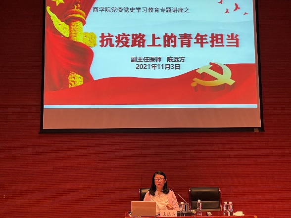 11月3日晚,pa电子官方网站邀请“上海市青年五四奖章”获得者、副主任医师陈远方于图书馆报告厅作“抗疫路上的青年担当”专题报告。报告会由pa电子官方网站学生工作负责人沈瑾主持,临港校区全体辅导员、入党积极分子及学生代表参加学习,闵行校区学生代表以收看直播的形式参会。