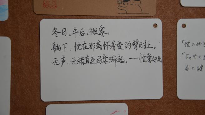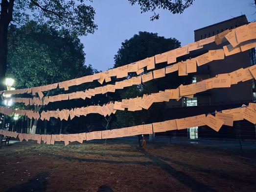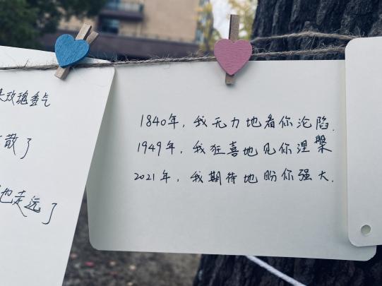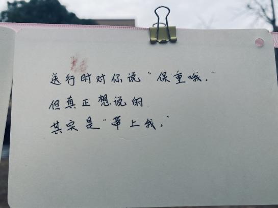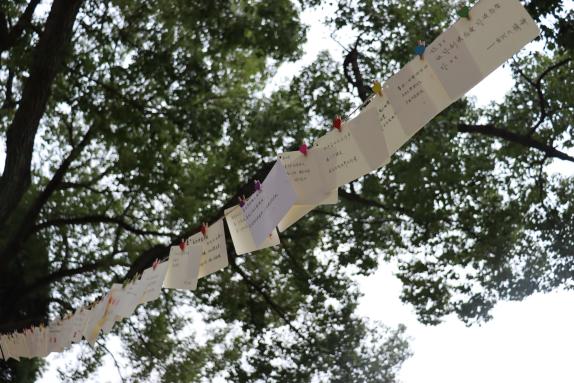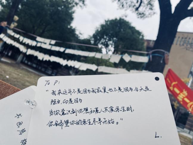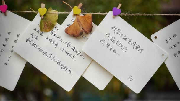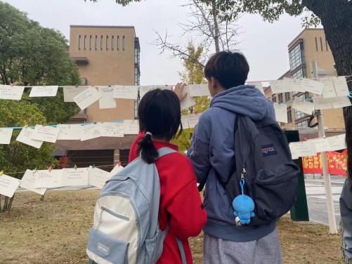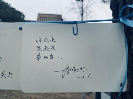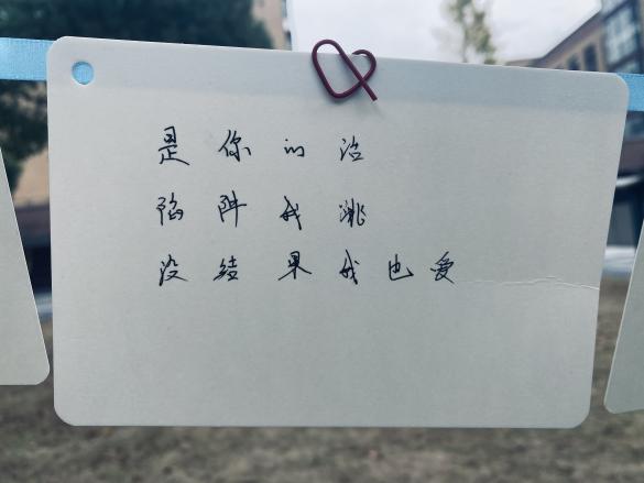 三行情书,纸短情长。其意义就是简化了繁琐的爱意,利用精致的三行文字直抒胸臆,让对方明白你的心。为此我们在临港校区半月广场和闵行校区明德堂门口开展了活动,给大家提供了一个抒发情感的平台。同学们的反响空前热烈,从布置现场开始,就已经开始有同学迫不及待的想来传达情感。同学们的热情超乎预期,志愿者们不得不多加一些展示窗口,供更多的朋友可以分享他们的思绪。于板中,于绳上,爱的定义被诠释的多种多样。有的人祝福爱人,有的人感情伤怀,有的人发出对未来的美好憧憬,小编还看到有些人对祖国母亲写下情书,看见有心人将稿件寄来时还附上了两片银杏叶,“忠贞不渝,相互坚守”以花语喻情诗,浪漫程度可见一斑。活动期间,除了商院同学们参与其中,还有其他学院的同学,留学生,甚至还有老师!大家看着挂满的信件,不知心中是否有些触动呢?飘摇风雨,睹物思人。活动后半程,虽时不时有风和小雨,但绳上的信件却不为所动,相信为爱情付出的大家也会如此,坚强且勇敢。