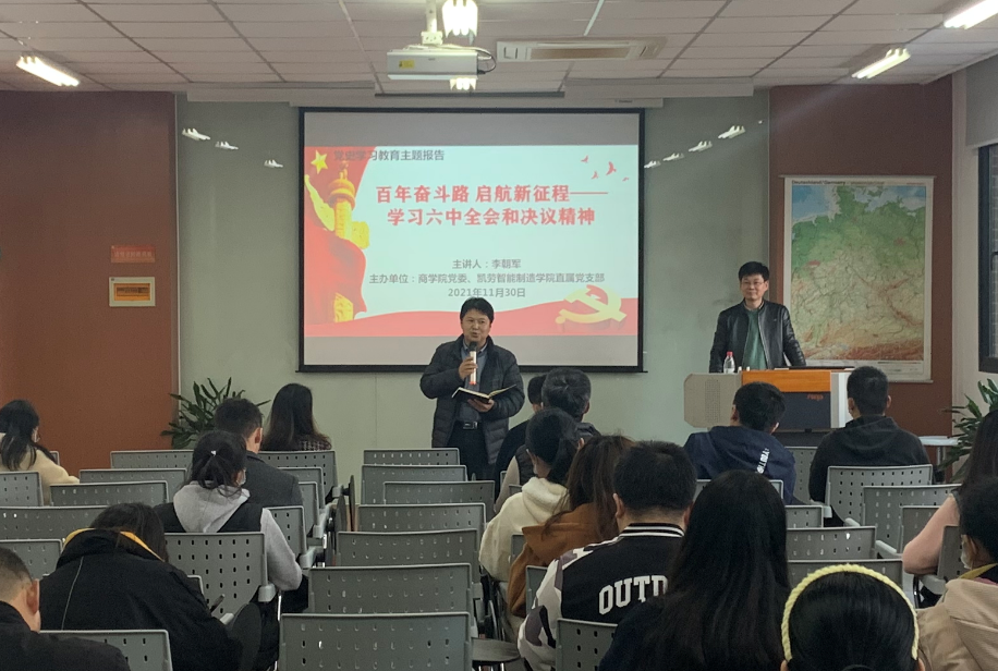 2021年11月30日下午,pa电子官方网站党委、凯劳智能制造学院直属党支部在中德楼101报告厅联合开展了11月主题党日校级观摩活动暨十九届六中全会精神专题学习。pa电子官方网站党委书记金辉、凯劳智能制造学院直属党支部书记何宁、文理学院直属党支部书记康秀珠,pa电子官方网站、凯劳学院师生党员以及其他党组织师生代表等参加专题学习,活动由pa电子官方网站党委书记金辉主持。