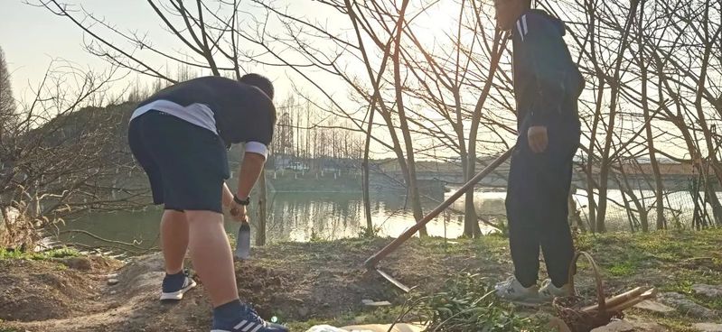 再往里走是一片空的土地,刘海峰、吴浩泽、马驰程几位同学对它进行了翻中。先是三人合力用铁锹对有些凝结成块的土壤进行翻整,三把铁锹一起一落,一上一下,有序且有力地叫醒着这块沉睡了一个寒假地土地。“康、康、康”、“砰、砰、砰”,铁锹遁地的声音有节奏地钻入了每一个干活着的人地耳蜗,平静而有力。很快,一块板结的土块便被翻整成能下种的样子。随后,马驰程、叶嘉玲、陈树菊三位同学将到货的七八株月季到月河边洗去包裹的失去一些养分的土壤。上来后,大家伙儿一起把月季、几株夹竹桃和菊花种在了刨好坑、浇好水的土坑里,默默许愿它们都可以结出喜人的果实。