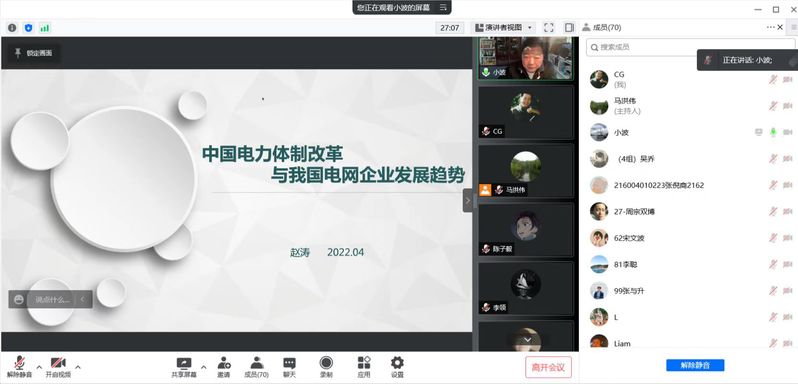 2022年4月14日,pa电子官方网站邀请了上海久隆企业咨询管理有限公司的赵涛总经理,依托腾讯会议平台,为pa电子一年级研究生举办了一次名为“中国电力体制改革与我国电网企业发展趋势”的线上学术讲座,来自不同学院的近百名研一学生参与了此次讲座。