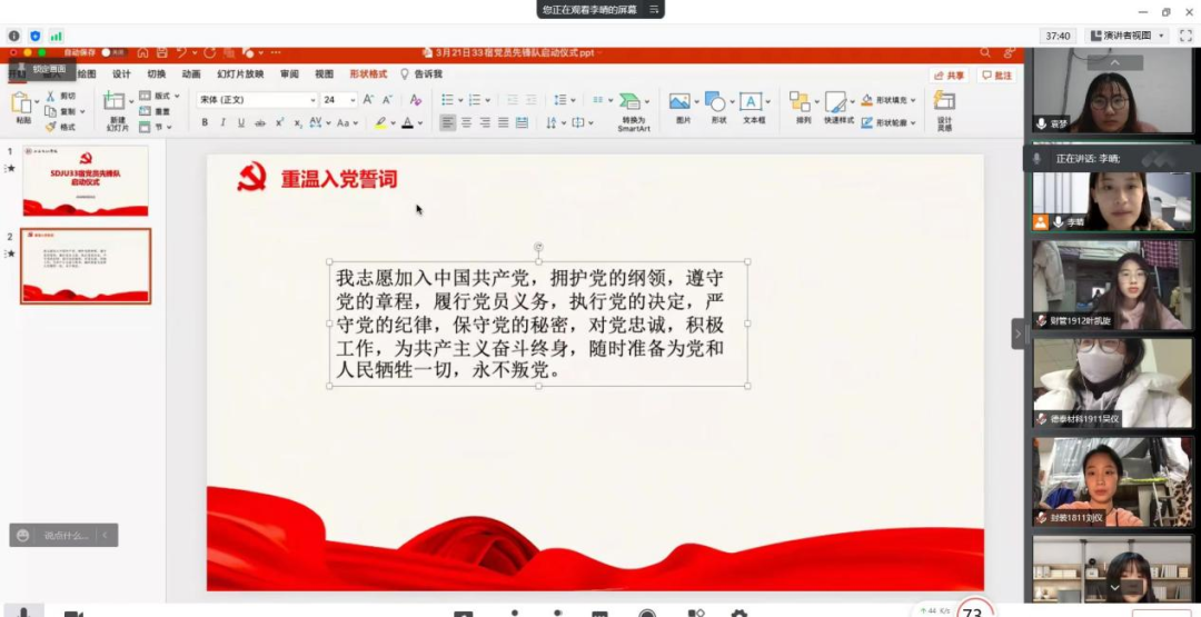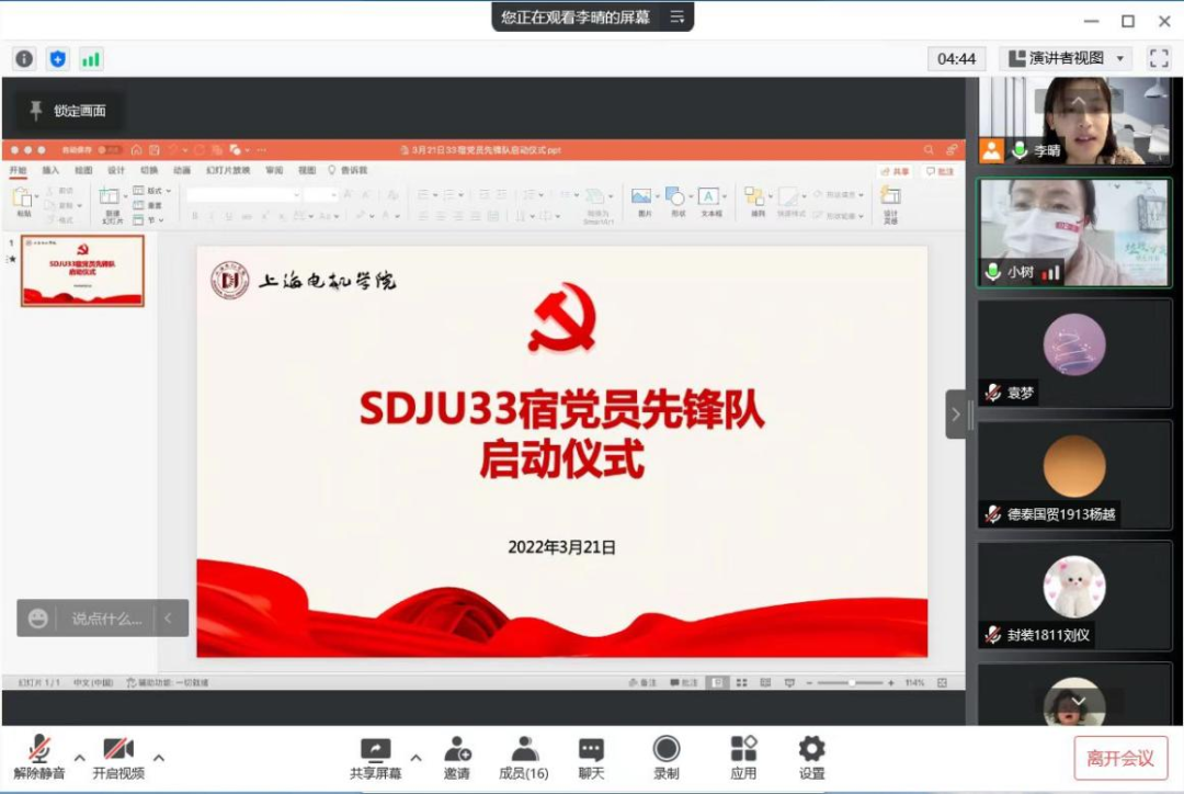 3月21日晚,由pa电子官方网站第九党支部书记李晴以线上会议的形式主持开展“pa电子官方网站33宿党员先锋队启动仪式”。pa电子官方网站学生工作副院长、副书记,33宿围合负责人沈瑾,电气学院辅导员潘娜以及来自7个不同党支部的16名党员同学共同参与了启动仪式。