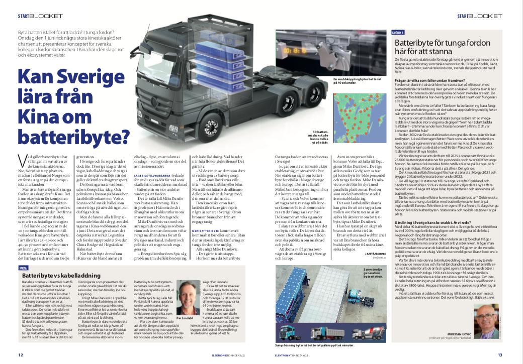 614日,瑞典专业媒体《Electronics and Electrics Newspaper》用了两个整版篇幅,以“瑞典能否向中国学习换电模式?”为题对61日召开的中国-瑞典换电重卡高端研讨会进行了深度报道。报道对该研讨会及中国企业在换电重卡领域的实践和成就给予了高度评价, 并指出虽然目前瑞典政府有意发展电气化道路,但瑞典市场对经济高效的电动重卡的需求已经很迫切。中国首创的换电重卡解决方案,打造了完整的产业链,并已经成功实现了上百个项目的商业化落地和良好运行,值得瑞典学习。