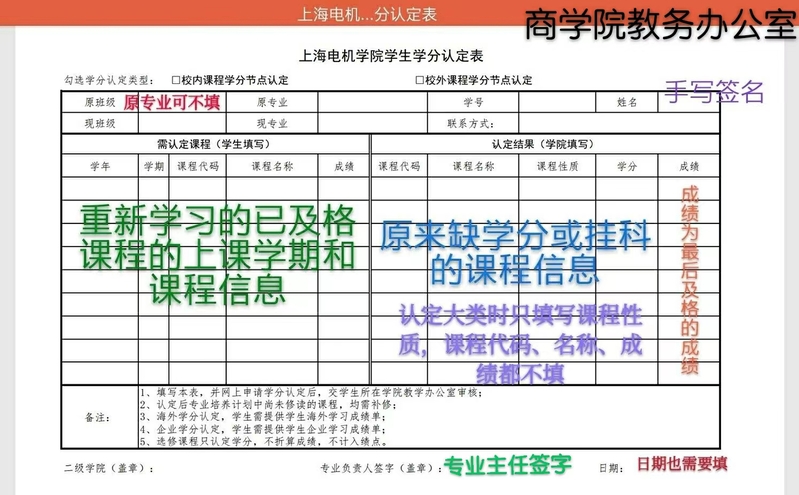 请注意,表格需要专业负责人签字,以证代分与认定大类相同,认定结果处只填写课程性质和学分