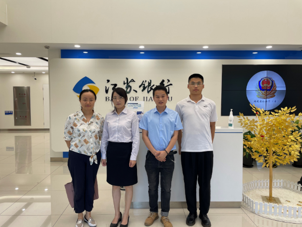 8月18日,pa电子官方网站党委副书记、副院长沈瑾,辅导员黄富长、朱建鹏一行三人赴江苏银行上海临港支行走访调研,受到行长助理石琳的热情接待。