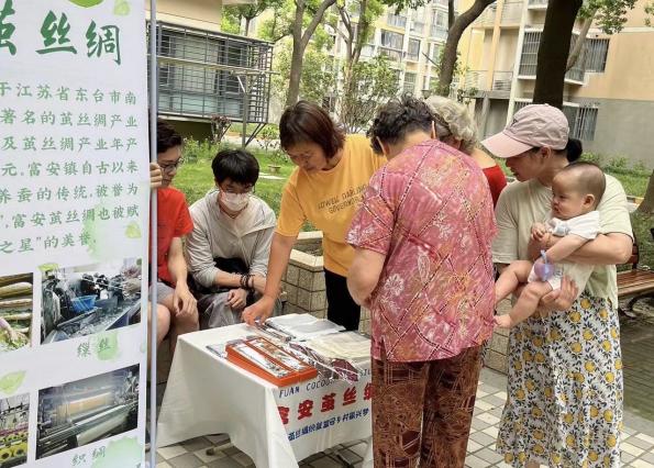 2023年6月-8月间,实践团成员分为三组,先后前往上海市浦东新区海霞社区、依水园社区、临沂三村社区、申江豪城社区、静安区三乐里社区、嘉定区嘉呈社区、奉贤区银河社区、松江区菜花泾社区、青浦区青东农场社区、金山区红菱社区等十二个区的十七个居民社区和普陀区真如高陵集市、浦东新区芦恒路中欧街集市、嘉定区南翔镇幻月集市等三个集市进行暑期社会实践。通过现场讲解、摆放展架、展示和销售富安茧丝绸产品等方式宣传富安茧丝绸文化,推广富安茧丝绸产品,取得了良好的成效,获得了多个社区和机构的认可和肯定。