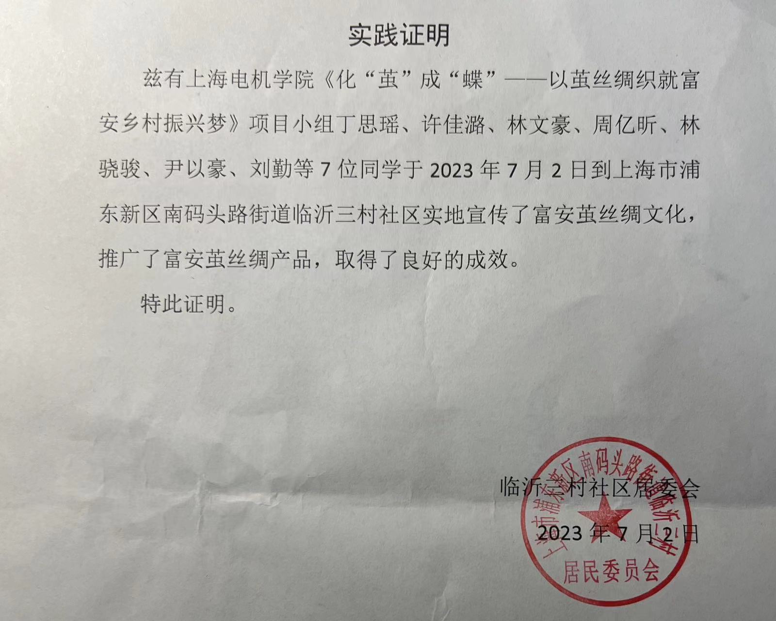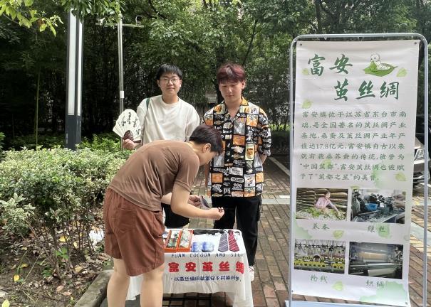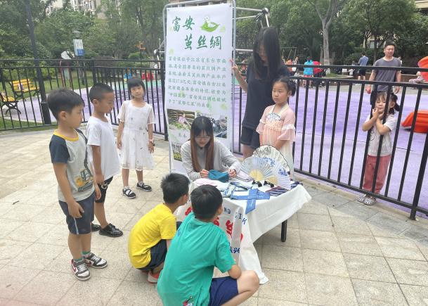值得一提的是,实践团为普陀区真源小区的小朋友们开设了一次“走进非遗——富安茧丝绸”专题宣讲课,向小朋友们展示茧丝绸工艺品,带他们亲身体验缫丝工艺。实践团成员通过牵线搭桥,实地走访与某公司签订代理销售协议,并由该公司代理富安茧丝绸公司所生产的产品在上海区域的销售,有效拓宽了富安茧丝绸产品的销路。