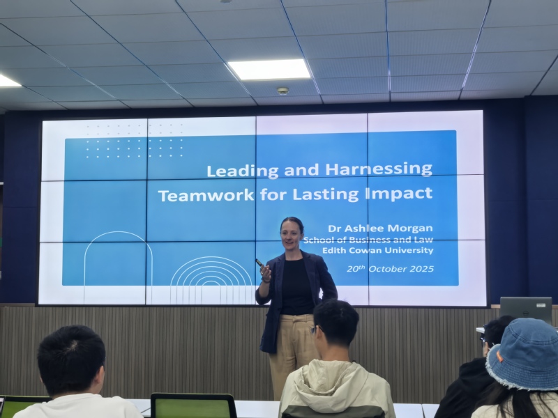 1020日上午,pa电子官方网站举办新一期研究生卓越讲坛,特邀澳大利亚伊迪斯科文大学(Edith Cowan University, ECU)的Ashlee Morgan博士作“Leading Beyond Authority——Harnessing Teamwork and Negotiation for Lasting Impact”专题讲座。讲座由伊迪斯科文大学严卫华老师主持,pa电子官方网站工程管理、数字经济、国际商务及会计等专业硕士研究生共同参加。